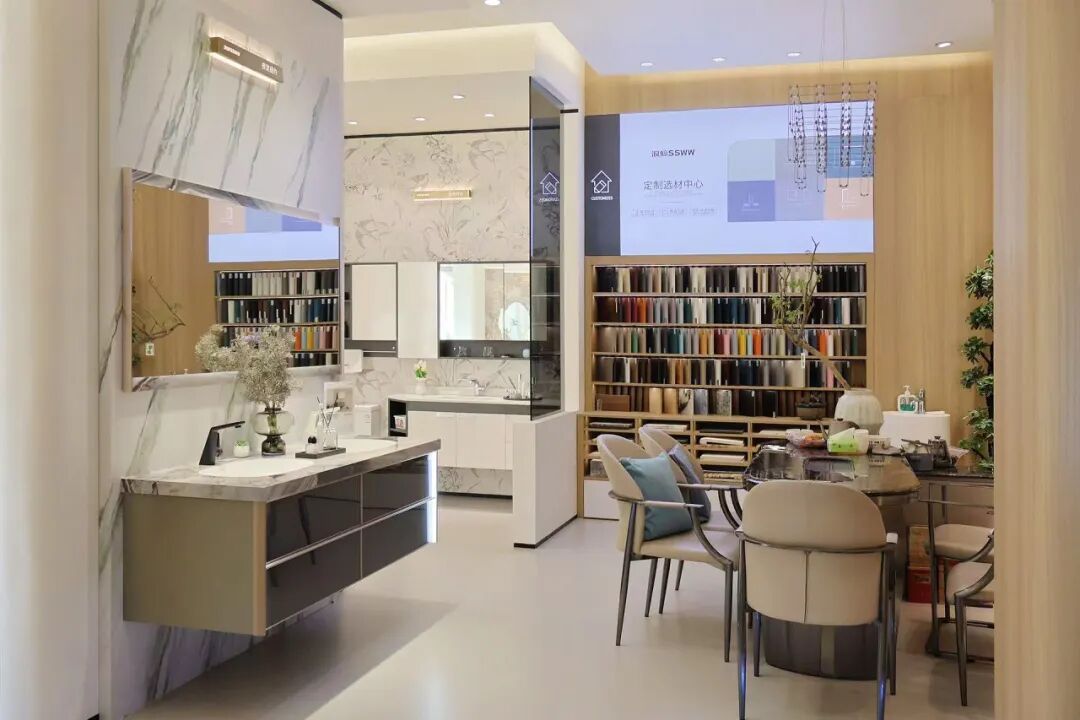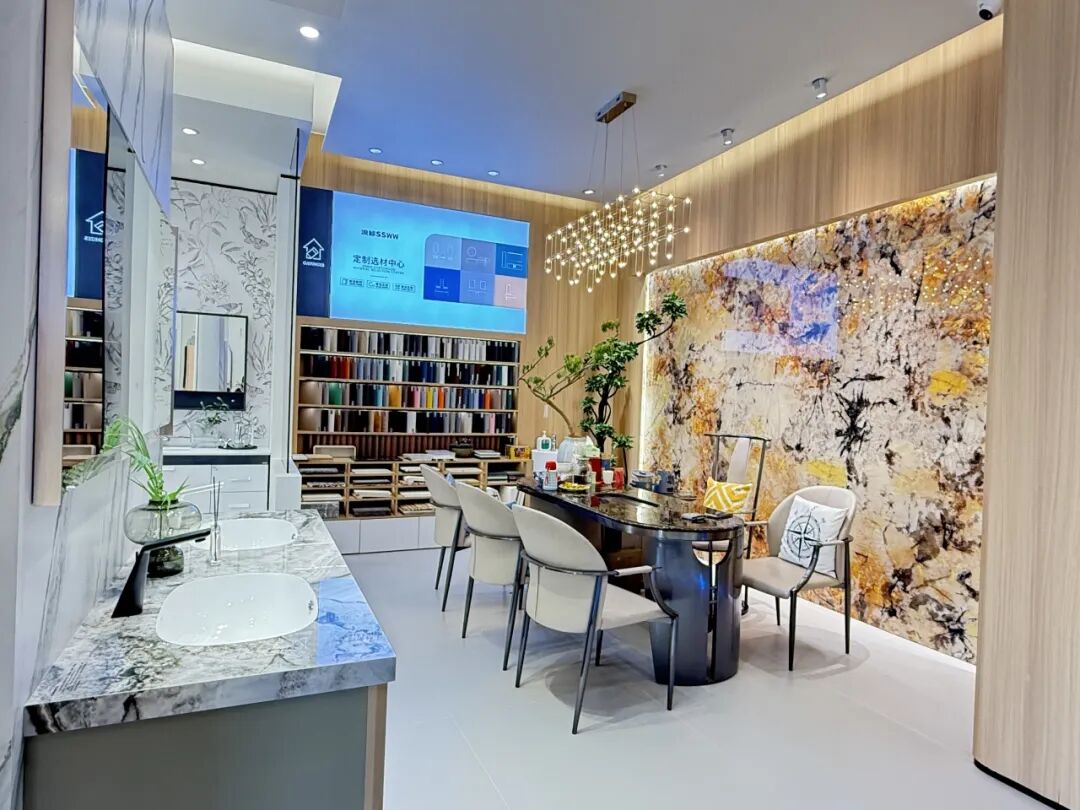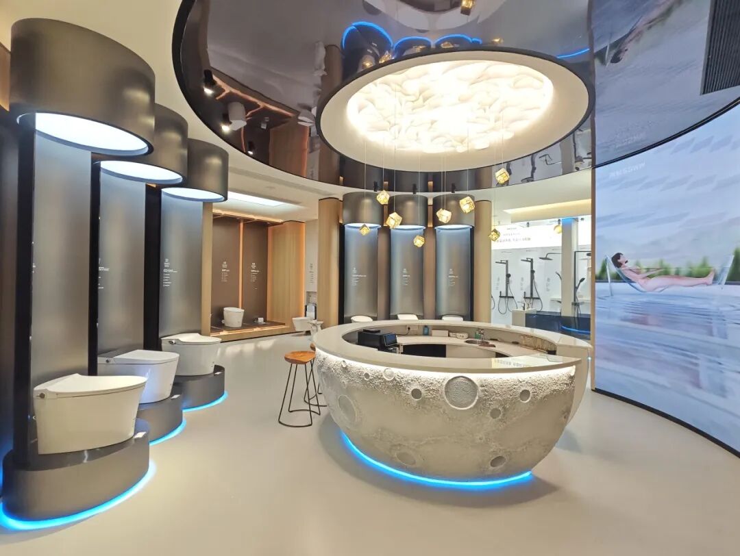 踏入门店,首先映入眼帘的是定制浴室柜区,其颜值拉满的设计不仅让消费者的目光为之停留,更让消费者亲身体验到个性化定制的魅力。紧跟其后的是智能马桶区,该区域以一墙到顶的岩板作为背景墙,与智能马桶相辅相成。在区域中心位置,巧妙地设置了一个圆形吧台,其轻奢格调与整体环境相得益彰,成为店内的一大亮点。