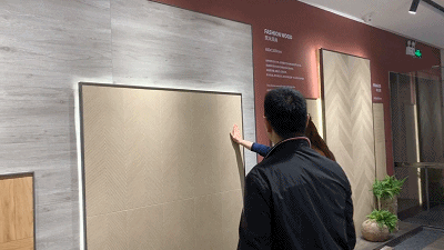 刚走进KT瓷砖,蔡老师和主持人就被墙面上的一款产品吸引了目光,这一款瓷砖的表面不仅有木纹,还夹杂有石纹,两种自然元素在同一款瓷砖上相映成趣。而这一款瓷砖正是KT瓷砖“木纹+”理念最好的展示。