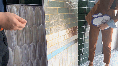 麦迪奇产品数量丰富到让人意想不到,除了刚刚所展示出来的产品外,麦迪奇还有大量产品藏在了选材区,供客户挑选。在当天下午明媚的阳光照耀下,选材区的一款产品闪闪发光吸引了蔡老师的目光。这一款瓷砖是麦迪奇新推出的“Skyline”(天际线)系列产品,是麦迪奇从意大利原装进口的特色瓷砖。由于独特釉料的加入,使得“Skyline”(天际线)系列的每一款产品从不同角度看都会呈现出不同的颜色光泽,极大地提升了产品的装饰性。