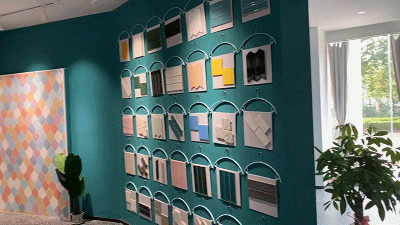 一个转身,邱总就把大家带到了麦迪奇的产品展示区。麦迪奇主营小砖和花砖,由于这一产品特性,麦迪奇创新性地采用了衣架展示,既可以非常直观地了解到产品样式,还方便拿取。