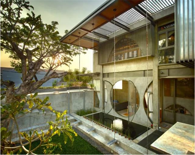 月亮形窗,用圆润的造型突破一成不变的形式,建筑师通过几个巨大的圆形和半圆形窗户将住宅、工作室与庭院花园联系起来。