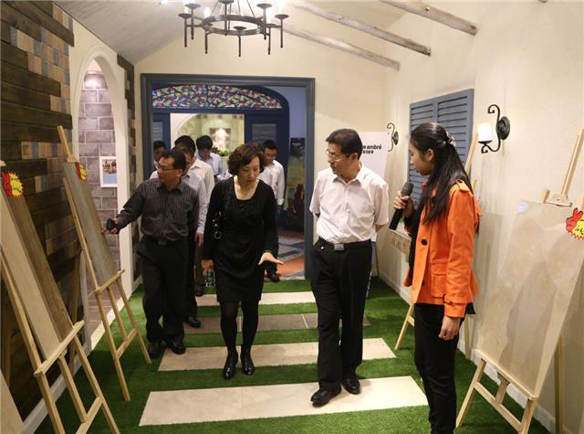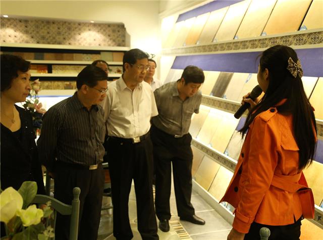 随后,考察团一行到达蓝珀展厅进行参观,独特的法式长廊、精致的仿古砖产品得到了考察团成员的赞赏与认可。