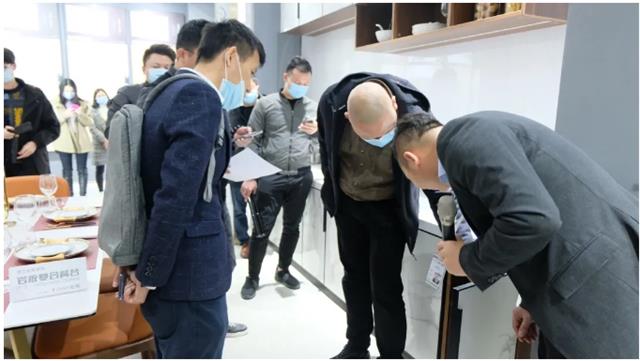 在简舍的一楼,岩板的橱柜设计应用吸引了代表们的围观拍照,独特岩石质感的岩板桌面, 让游学团们爱不释手,忍不住去摸摸,并由衷称赞加工切割技术的精湛,粘贴完整且看不出缝隙。在观摩的过程中针对岩板橱柜的加工、安装提出的相关疑问,顾总都一一耐心解答。