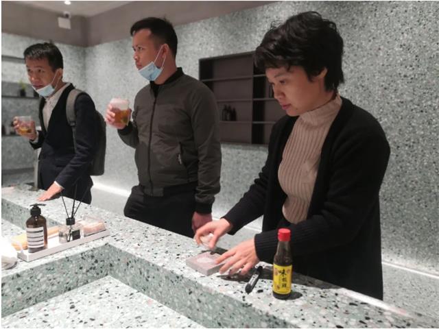 期间,现场工作人员为游学团演示了水磨石板材的防污性,同时还为他们讲解了各类再生石的性能、应用的区别,为他们对再生石使用的困惑一一解答。并希望未来可以和游学团代表们加强交流、深入合作。