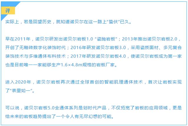 据悉,诺贝尔斥巨资研发并成功投产了诺贝尔5.0全通体系列,是首家实现“色彩通体”、“材质通体”、“纹理通体”的岩板,装饰效果与石材无异。