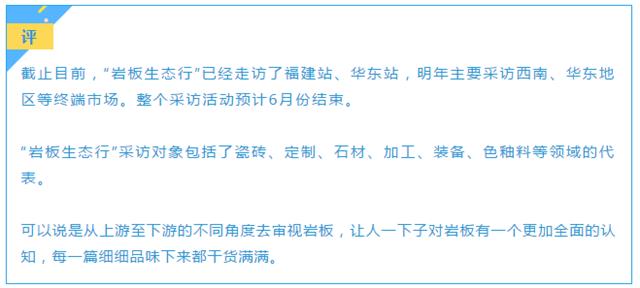 从2020年9月开始,岩板生态行已经采访了LAMINAM XL12中国区负责人沈夏鹏,厦门市橱柜业商会秘书长陈庄,宝贝全屋定制董事长余军,鼎创石业总经理黄源锋,石功夫福建省负责人陈添边,金宝莱全屋定制张何鲁,蒙娜丽莎绿屋建科总经理蒙政强,蒙娜丽莎绿屋建科大区总监潘启汉,蒙娜丽莎岩板全案设计中心负责人颜槿, 西斯特姆(中国)科技有限公司董事、常务副总经理陈东,美国莫和克工业集团(意大利马拉齐集团母公司)亚洲区总经理葛宏明博士等。