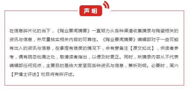9月10日,广东陶瓷协会发布通知,协会定于9月24日下午14:00-17:30在广东佛山华夏明珠国际宴会中心二楼第五会议室举办2020《陶瓷岩板》标准与质量发展论坛。活动内容包括:《陶瓷岩板》团标工作介绍、陶瓷岩板应力解决方案;陶瓷岩板质量宣言;陶瓷岩板分会筹备工作;颁发陶瓷岩板参编证书;陶瓷岩板质量论坛等。