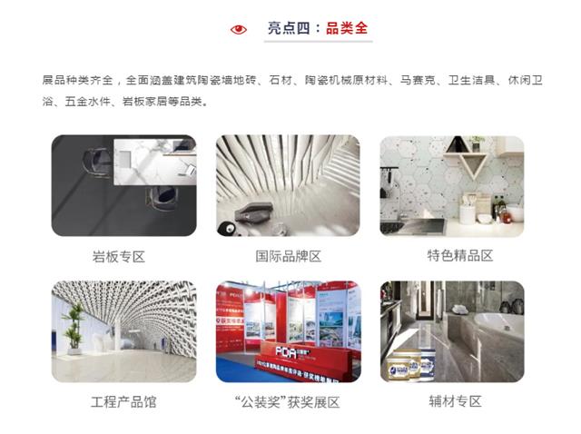 本届展会根据当下行业流行趋势,在三大展馆设置了原创产品区、国际精品区、岩板产品区、特色精品区、辅材区、“公装奖”展示区、岩板家居馆等主题专区,想看未来行业趋势产品,来佛山陶博会就对了。