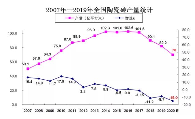 2016年,对中国建陶行业而言,是有着分水岭意义的一年。在这一年,中国瓷砖产量达到102.6亿平米的峰值,随后在中国经济由高速发展迈向高质量发展的大背景之下,一路下行至2019年的82.2亿平米,中国建陶行业正式迈入“新时代”。