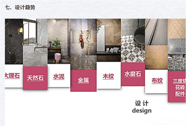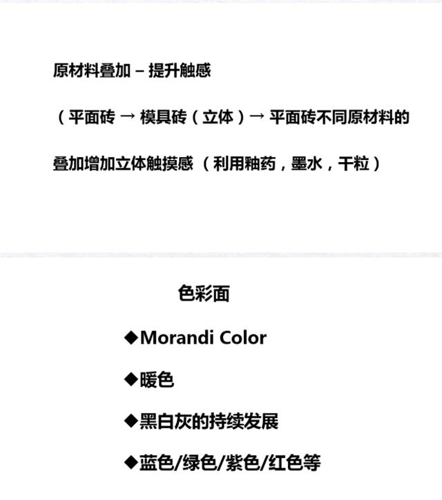 这部分应该是重点,就是2021年或者2020年,大部分的工厂现在都在玩的,以前的平面砖改成模具砖,平面砖不同原材料的叠加,增加立体触摸感,不管是釉料、喷墨等等的这些东西来做,而是用干粒叠加起来,做成有点立体感的东西,实际上从去年开始就已经在做的事情,今年大家会更注重这部分,因为主要就是触摸板的部分。最舒服的颜色,这个颜色还是会出来,黑白灰持续发展,永远不会淘汰,蓝色、绿色、紫色、红色,这些颜色主要是釉料厂商提供的。