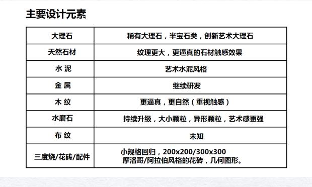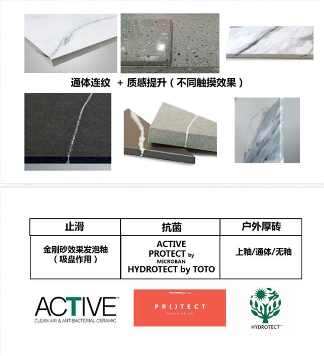 大板的部分,2021年大板的重点应该是在通体,通体迎来质感的提升,不管是亮面的、亚面的,亚面也有不同等级的亚面,甚至用在地板上面的跟用在台面上的亚面不一样,因为你不能有太多的毛细孔,所有的产品会变成做大板品牌的一个主流产品之一。还有就是功能砖、扣具在意大利,包括IRIS集团也好,PANARIA集团也好,他们都有在做,PANARIA和其它公司合作的一些产品,这一类的产品会出来,或者说还是一样会去发展,规格会越来越大,甚至于会有异形的规格。