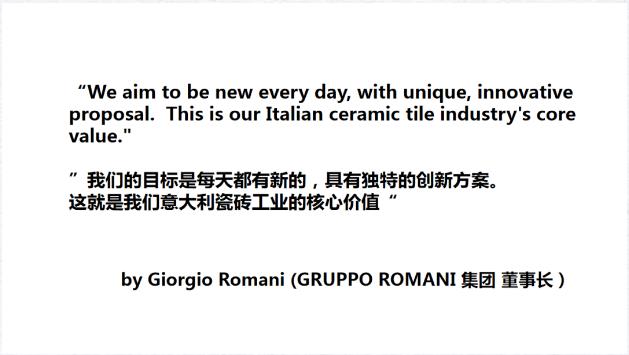 还有就是我的老板,罗马尼集团说的,我们的目标是每天都有新的,具有独特的创新方案,这就是我们意大利瓷砖工业的核心价值。