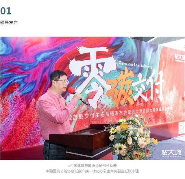 活动现场中国建筑节能协会秘书长助理、中国建筑节能协会低碳产融一体化办公室常务副主任张永建表示据了解陶瓷行业围绕“双碳”目标的相关要求,已经在加快节能低碳技术推广和落地。贴大师加强工艺技术创新,推动应用先进的铺贴技术,强化铺贴交付全生命周期绿色管理,大力推进绿色工艺、低碳材料,推动交付生态的高质量发展。