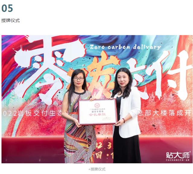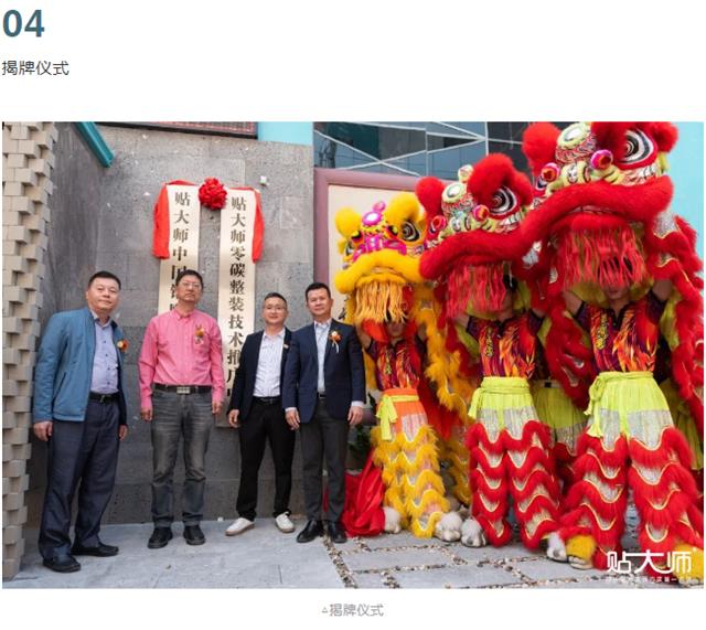 秉承匠心精神,聚合匠心、创新工艺,全力推动岩板走向生态成品交付,基于贴大师在零碳生态领域做出的技术突破和推动全国铺贴工匠工艺迭代取得的示范效应,特授予”贴大师零碳整装技术推广中心、贴大师中国铺贴工匠俱乐部”。中国建筑节能协会秘书长助理、中国建筑节能协会低碳产融一体化办公室常务副主任张永建、广东陶瓷协会秘书长王卫国、广东省建筑防水材料协会会长张泳东、贴大师创始人魏海峰共同揭牌。